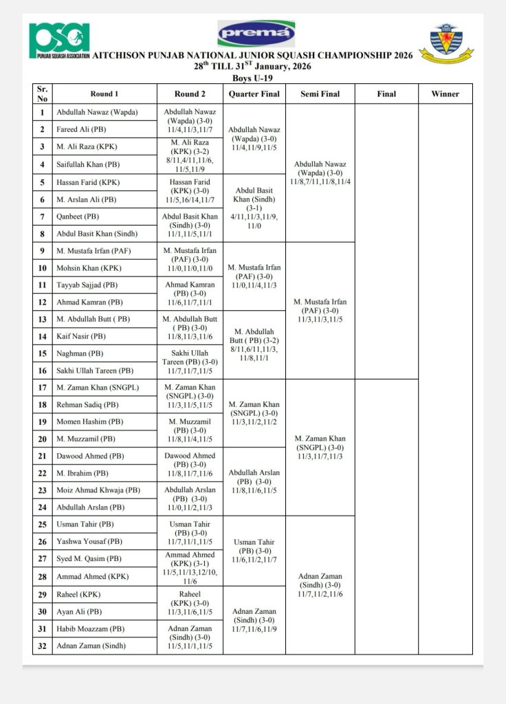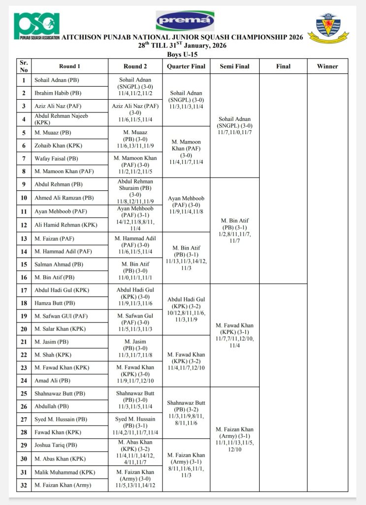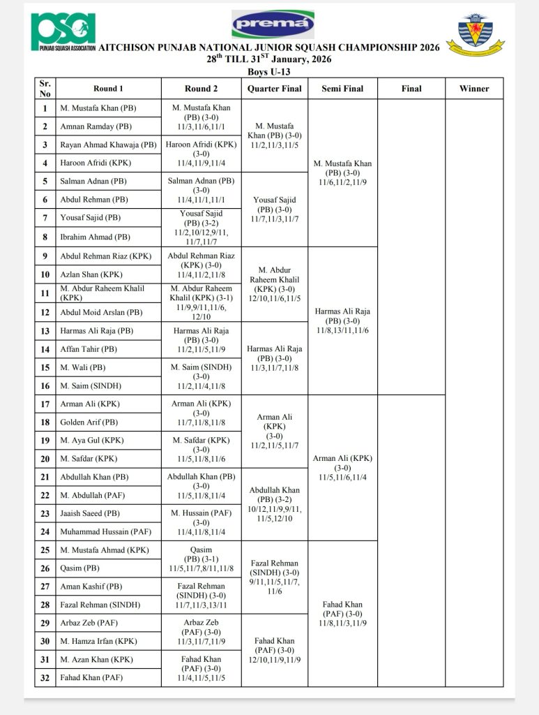 The championship commenced on 28 January, 2026, at Aitchison College, Lahore. The second round and quarterfinal matches were played today, January 29, 2026. The semifinal matches are scheduled to take place tomorrow.